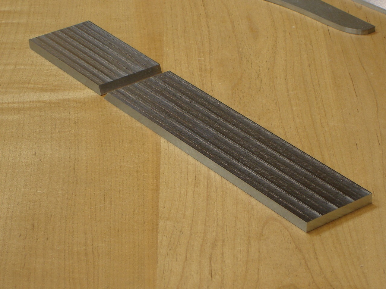 Creating the stainless tweed pattern on the interior surface of the sole requires indicating every part when it is put into the vise and quite frankly what passes as precision ground bar these days usually isn't quite accurate enough to accommodate a milled texture that is only .002 deep in the surface. Therefore these pieces have to be reground here in the shop. The tweed pattern is a math/milling puzzle and attempting to assure that it is perfectly centered on the plane sole can drive a plane maker "round the bend."The picture below shows the process of milling the tweed pattern, anyone can cut milling patterns in metal but to cut a milling pattern that has a holographic effect and looks like tweed fabric is a different thing altogether. It requires the correct starting point, the proper pitch of the overlap, the correct feed rate and depth of cut.