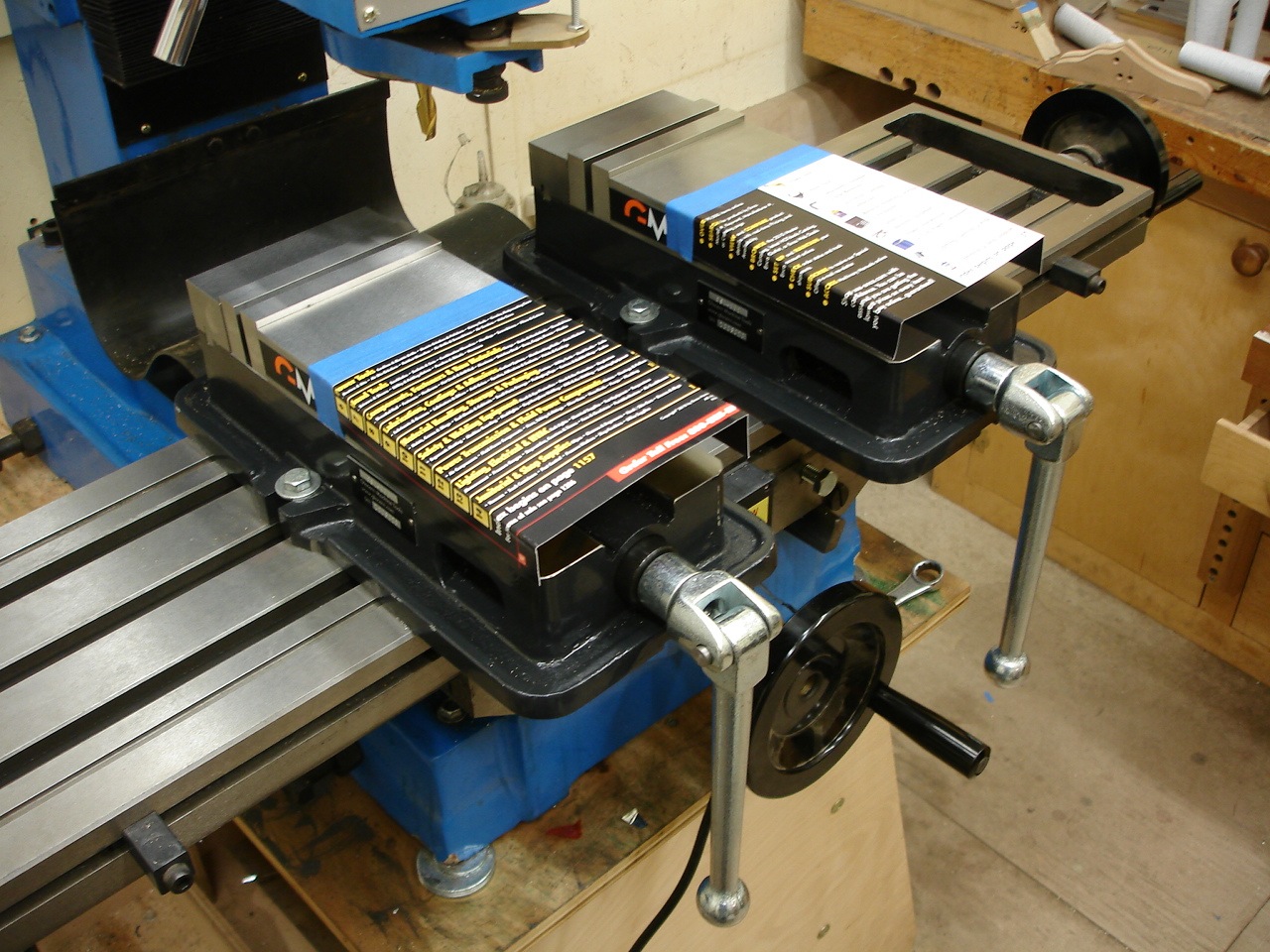 The picture below features two new additions to the shop. When attempting very precise work in demanding materials accurate working holding is very key. These two Glacern vises are very well made tools and are quite up to the task once they've been accurately set and indicated to the mill spindle and one to the other. I indicated these vise the same day I milled the stainless tweed pattern on two set of plane soles. Somedays you can just wear yourself out with math.