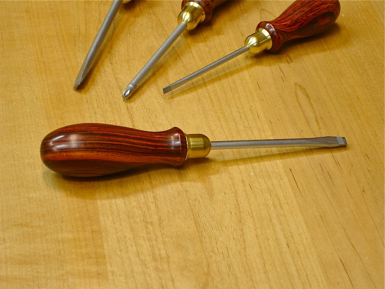 I’ve waited a long time for a good set of screw drivers and these guys have obviously put a lot of effort into developing these tools. These tools consist of hand turned cocobolo handles, German tool steel shank and tip with brass ferrules integral of the handle insert that gives these screw drivers such a solid and well put together appearance and feel. The tips fit the slots of common size screws quite well and don’t ding and deform the edges of the screw head slots.