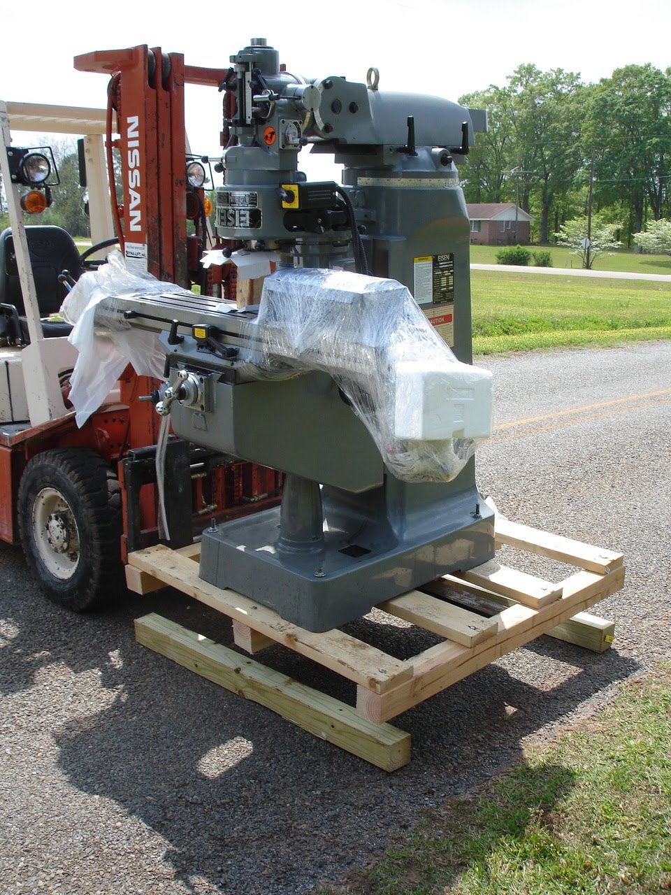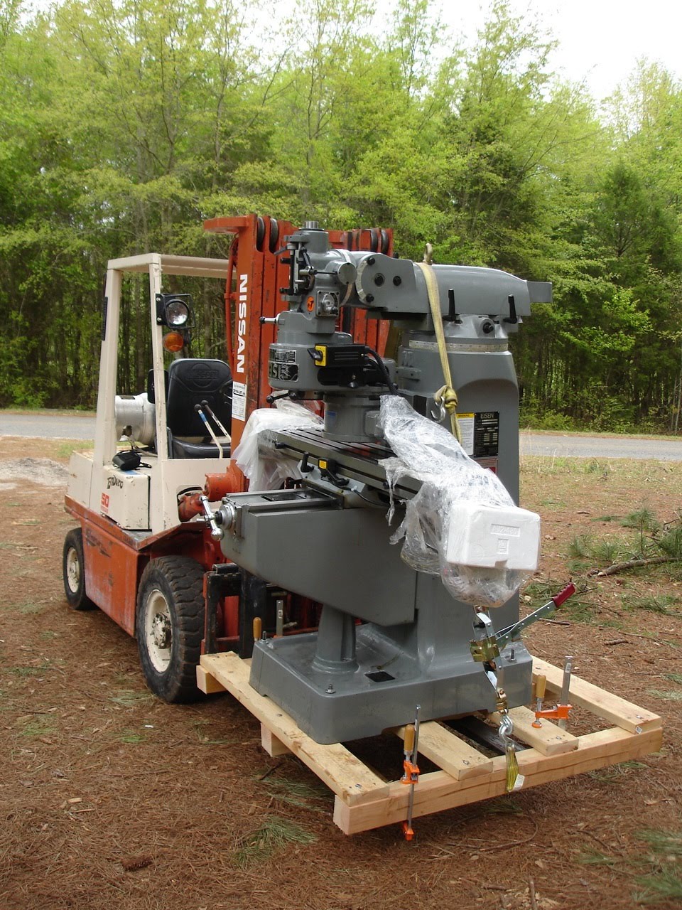 When I put the forks of the lift under the pallet and raised them I could feel the hydraulics of the lift straining to raise this load. The first thing that came into my mind was "what have I done?", immediately follow by a mental picture of this thing crashing thru the floor of my shop and onto the ground underneath. However I was too far into this to turn back. The truck driver had just completed a trip of 2200 miles with this mill on his truck and I don't think he would have taken very kindly to the idea of making a return trip.