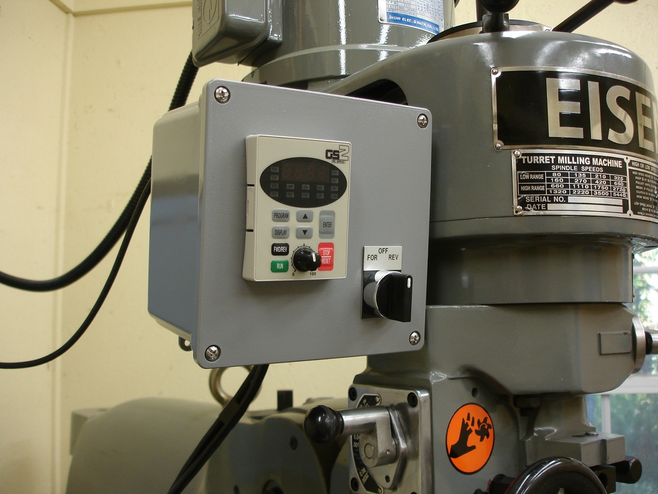 In stock condition this mill achieves speed changes by moving the drive belt to different pulley positions. I have already upgraded this aspect. This mill now has digital speed control achieved thru a device know as a VFD or Variable Frequency Drive unit. This is one of the more technical aspects of this entire ordeal and required a good deal of research to sort out the wiring, installation and programming of this device. When it all worked I declared myself an "Electro-Magician".