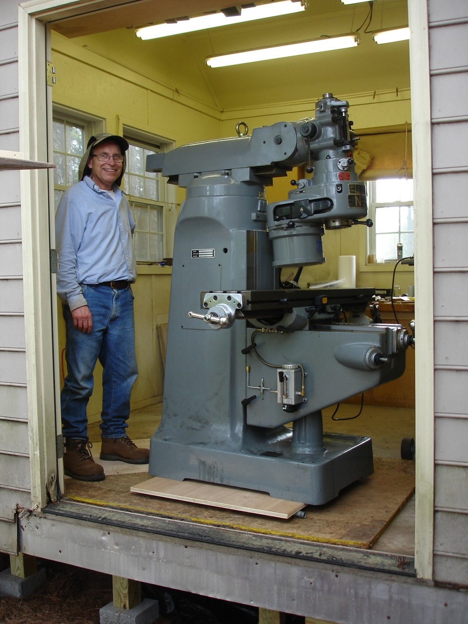 To actually set the mill into the shop it was removed from the pallet and held aloft under the ram of the head. I was very deliberate with this entire process. This was no place to get in a hurry. Finally it was in the shop. The person in the picture below is my friend Terry Sebright. He's not a big guy by any means, however seeing him in comparison to the mill you get an idea of the size of this machine.