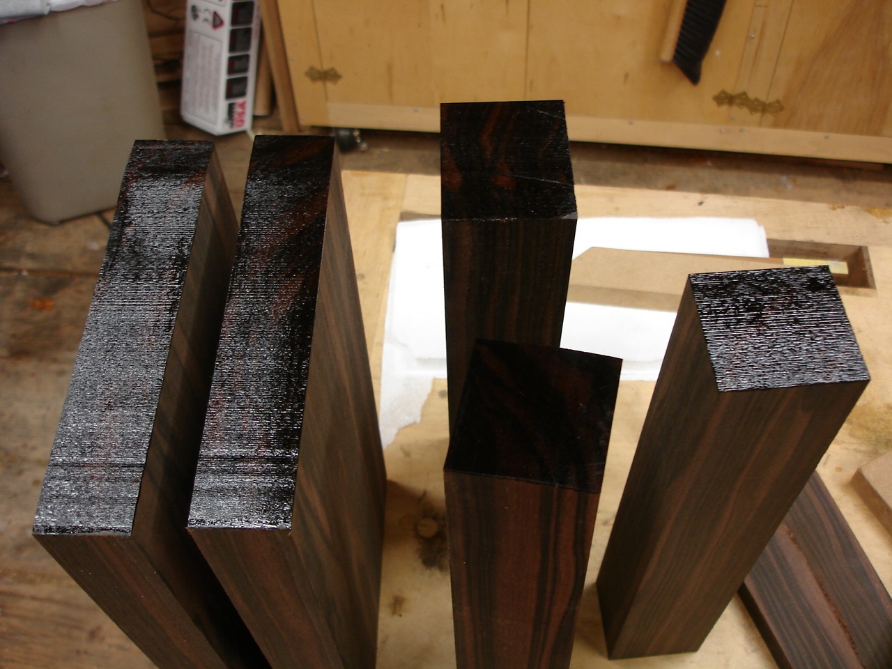 Now I have many surfaces exposed directly to the air for the first time so I worked quickly to seal the ends and spray a light coat of lacquer on the flat sawn surfaces of the tote blanks. All this in an effort to slow down the effect of being exposed directly to the effects of the atmosphere. Now these blanks get to rest for a while and if I've done my job correctly the next time you see them they will be plane parts.