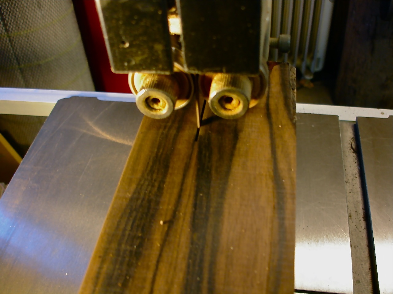 Past experience has also shown me that it is best to begin the process of breaking down log segments and billets by cutting pieces off the length in increments of 11". If there are checks on the end of the piece then the first piece will probably need to be just a bit longer than 11". This billet was 4.75" thick 6.5" wide and 53" long. Maccassar Ebony has very high specific gravity, yep it will sink in water just like a rock. This also means this piece was quite heavy. It was all I could manage just to hold it on the table of the bandsaw and feed it thru the first cut off it's length. I suffered thru the first cut knowing that every subsequent cut would make the piece lighter. Now that I had my first section cut from the length of the billet it was time to start re-sawing.