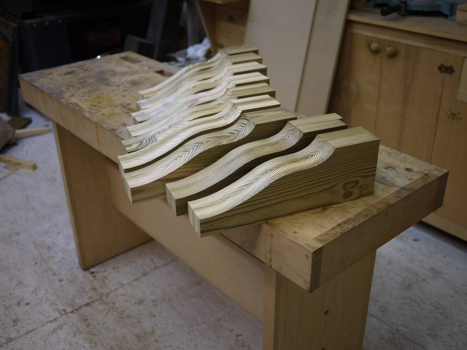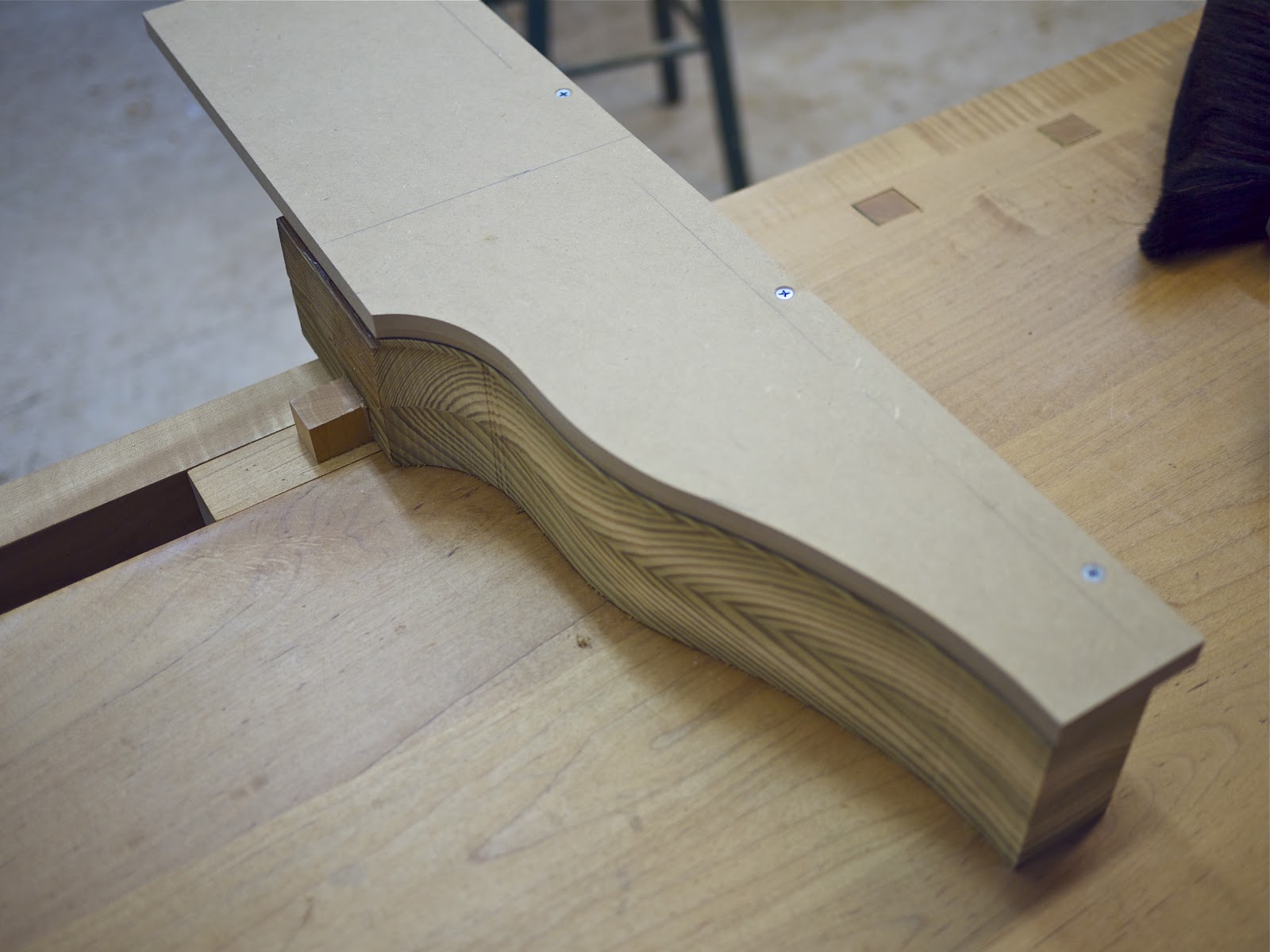 We made a template of the shape we wanted and used it to layout the blanks and rough the shape out on the bandsaw. We then used the template to guide a large flush trim router bit that would refine the shape.