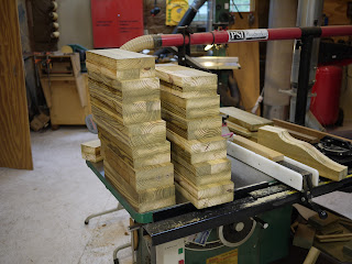 Luckily I had stored some left over pressure treated 2 x 12s and 2 x 10s under my shop for the last 6 years. (left over from house construction)This material had time to thoroughly air dry and was the perfect material for the rafter tails. The design required that we rip pieces to width and then joint and laminate them face to face. You can see a stack of the glued up and somewhat processed blanks in the picture below.