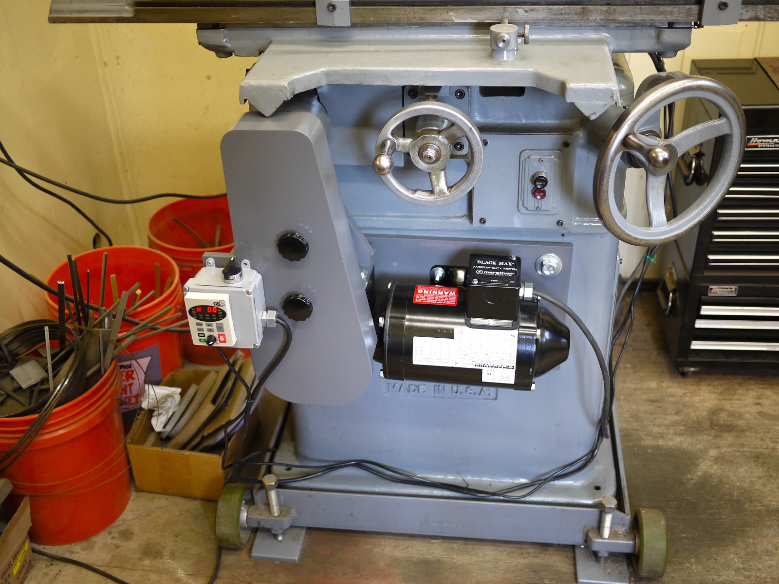 The motor control configuration was sorted out after a study of the VFD manual....actually an extensive study. I have two other 3 phase motors in my shop powered by VFDs, however I would be asking this one to perform more complex motor control than anything required on the other machines. The picture below shows all the components mounted to the machine and also a belt/pulley guard fabricated for safety sake.