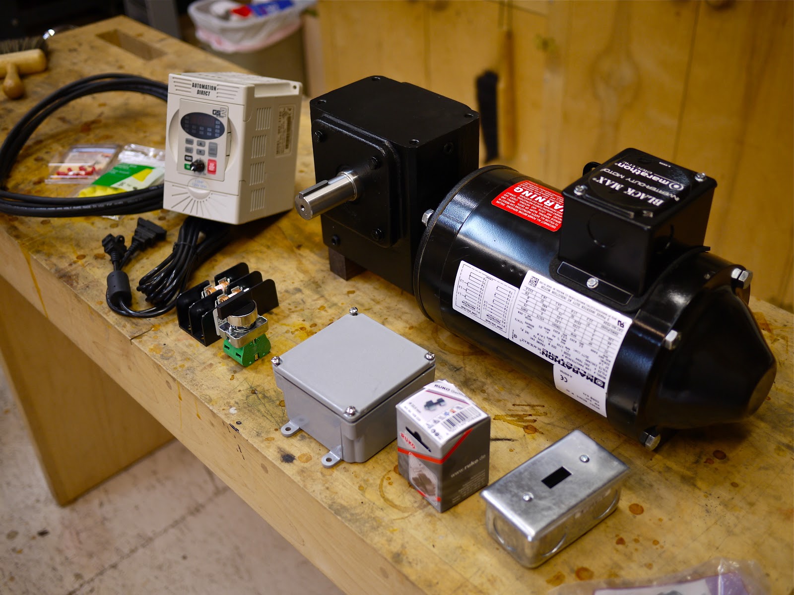 A 1/2hp 3 phase inverter rated induction motor, a 40 to 1 gear box (speed reducer), GS2 Variable Frequency Drive, not shown are the miscellaneous wiring devices, various pulleys and belt required.