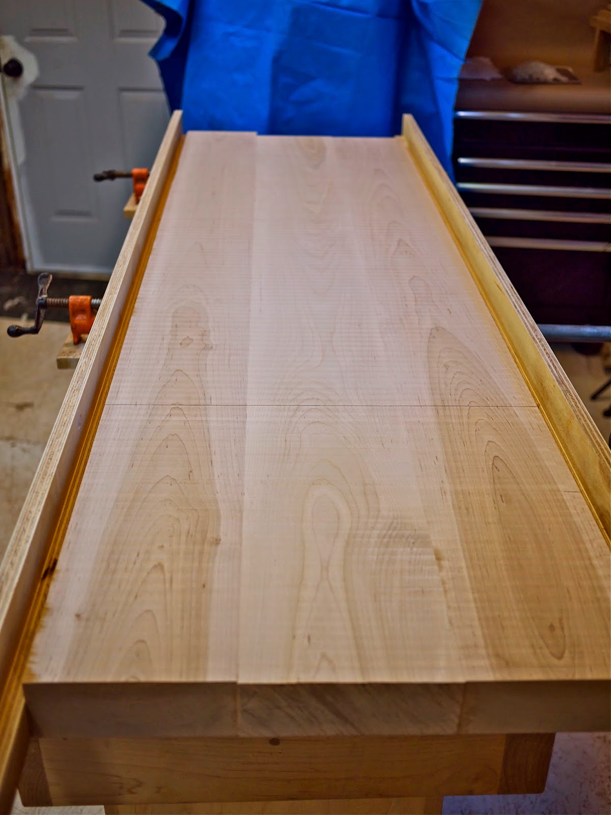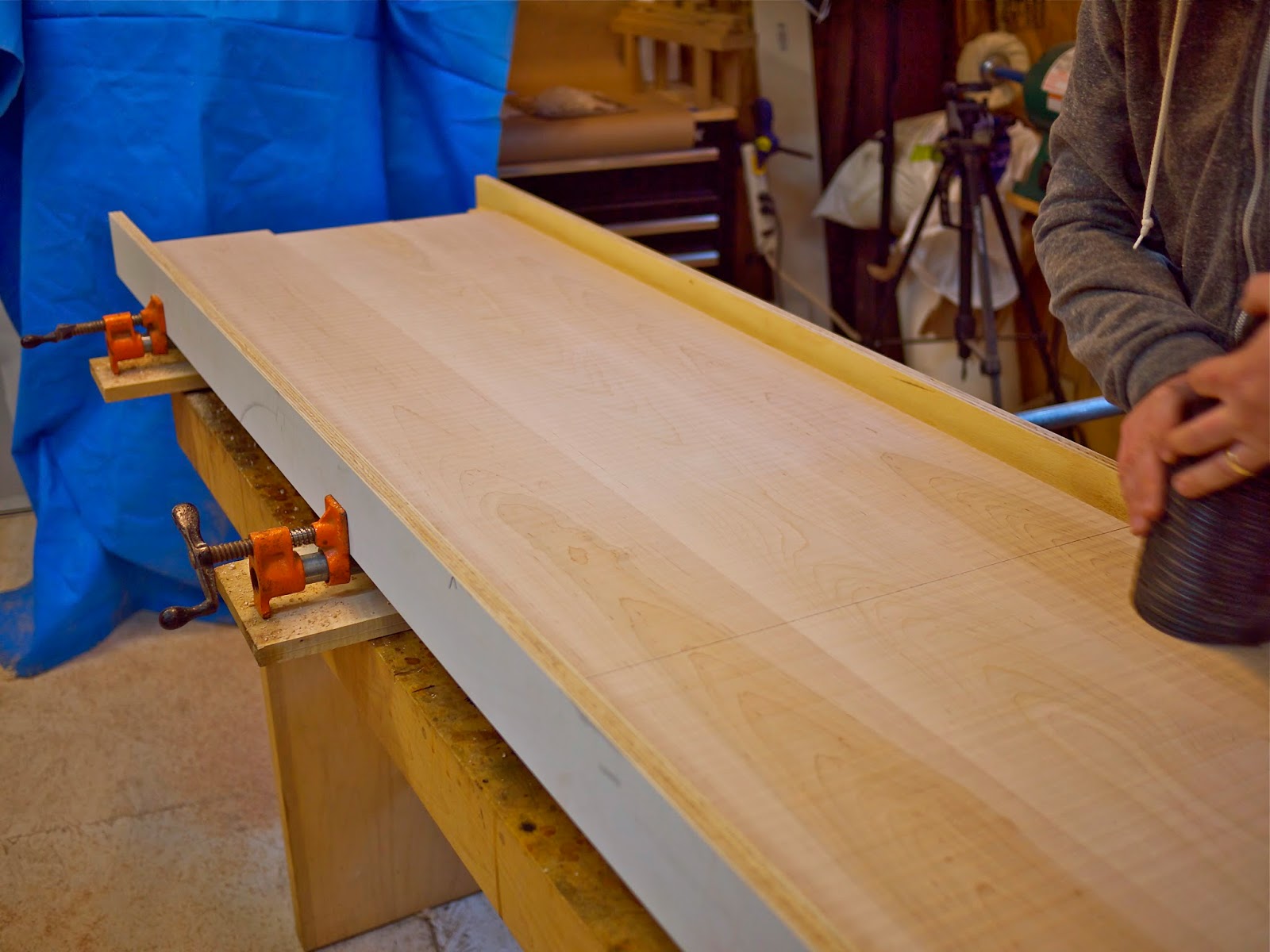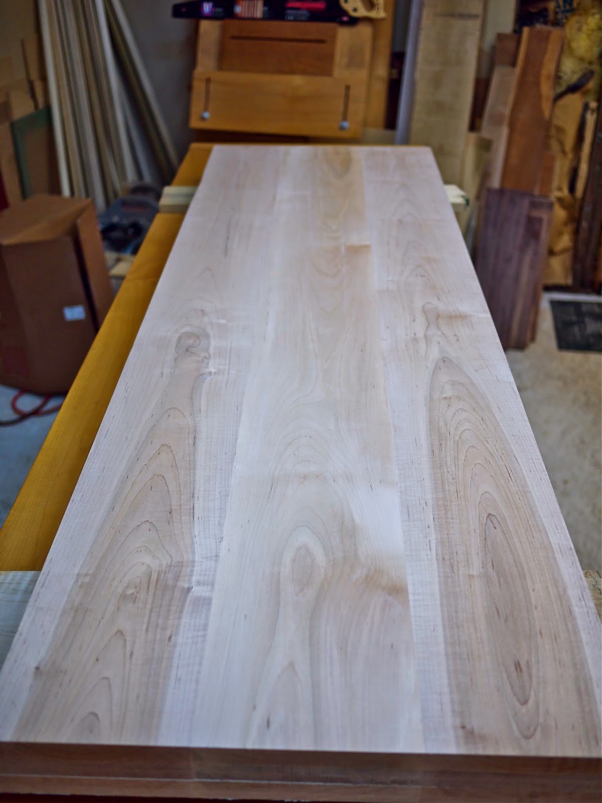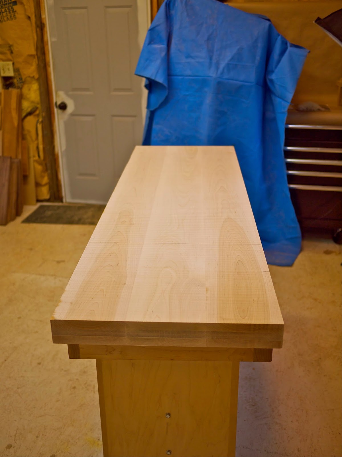 Daniel cut the top to length with a hand saw. A couple of years ago I was in the NWA showcase in Saratoga Springs, NY. Adam Cherubini was there by himself setting up his bench in his booth space and I sent Daniel over to lend him a hand. He also helped Adam with a computer issue related to the camera he uses to display a closer look at his hand work. After that issue was resolved I looked over to see Adam giving Daniel a sawing lesson. He spent a while with Daniel showing him the in's and out's of using a hand saw. That lesson cam in handy for Daniel while he was cross cutting a 20" wide piece of 2 5/8" thick maple.