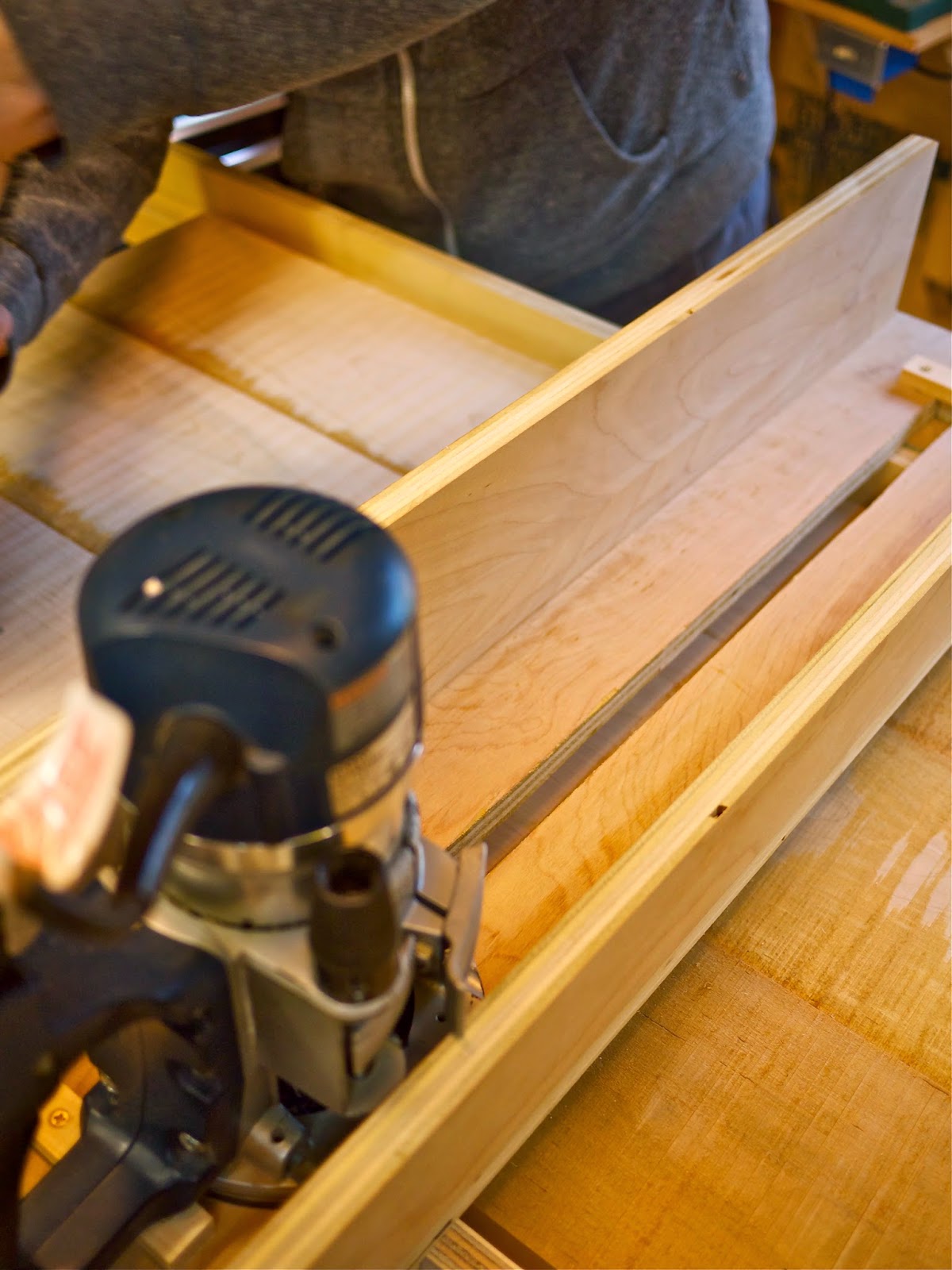 The next day we were faced with the dilemma of how to process the top surface of the glued up blank. I explained to Daniel that we really had 3 choices. We could do it by hand, but I don't really have a jack plane set up for heavy material removal, we could travel to Bo' Child's shop in Barnesville and see if he would run it thru his Martin planer, or we could build a router sled and do the rough removal with that tool. We were both intrigued with the idea of building the router sled so we found what we needed in my wood storage area to cobble together two accurate rails and enough birch plywood for the sled. Couple hours later we were ready to surface the top of the glue up.