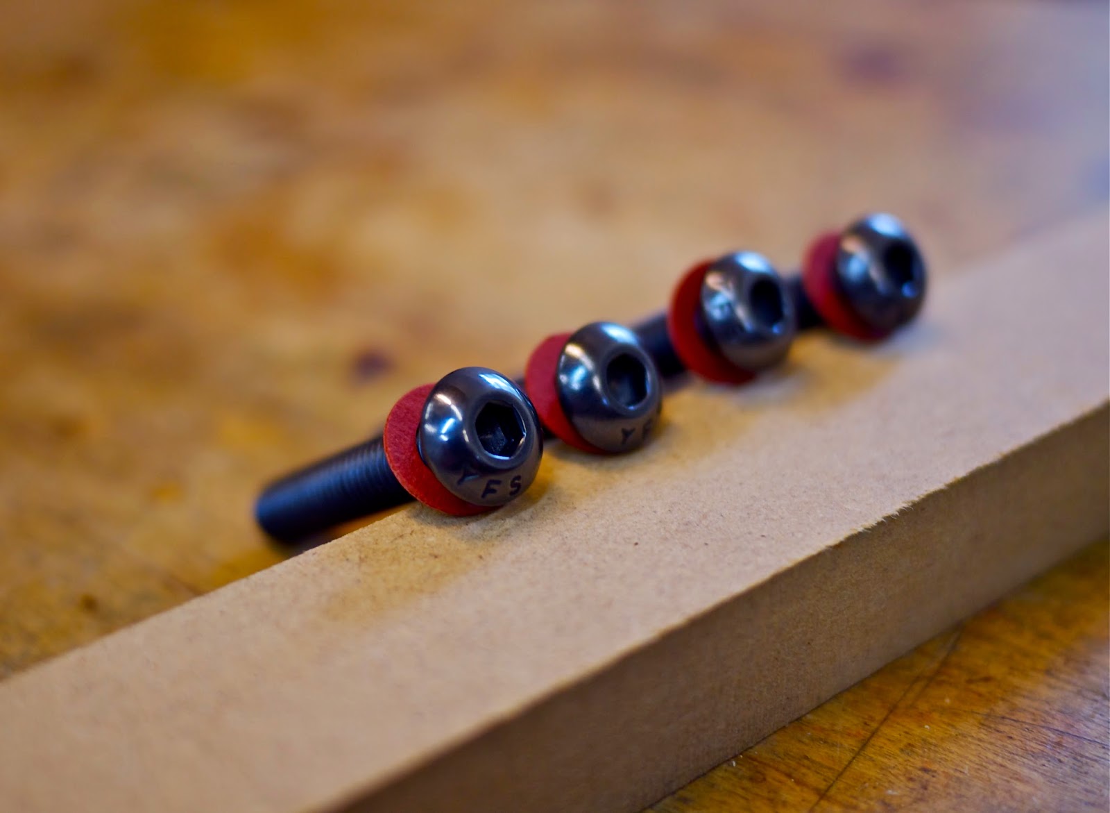 I replaced all the assembly hardware. I purchased button socket head screws in a black oxide finish. I then polished the heads of the screws and applied gun bluing twice polishing them with steel wool between applications. Then I polished them on my buffer until I had something that looked like black chrome. I acquired red fiber washers to accent the black.