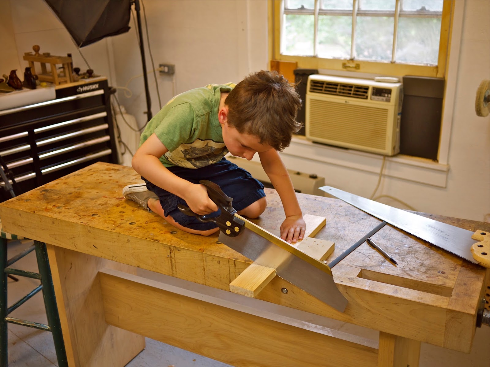 Make certain the project includes task they can accomplish themselves. They enjoy it and it gives them a sense of ownership in the project. 5 year olds can get away with working in the shop in their shark print pj's. Adults, not so much.