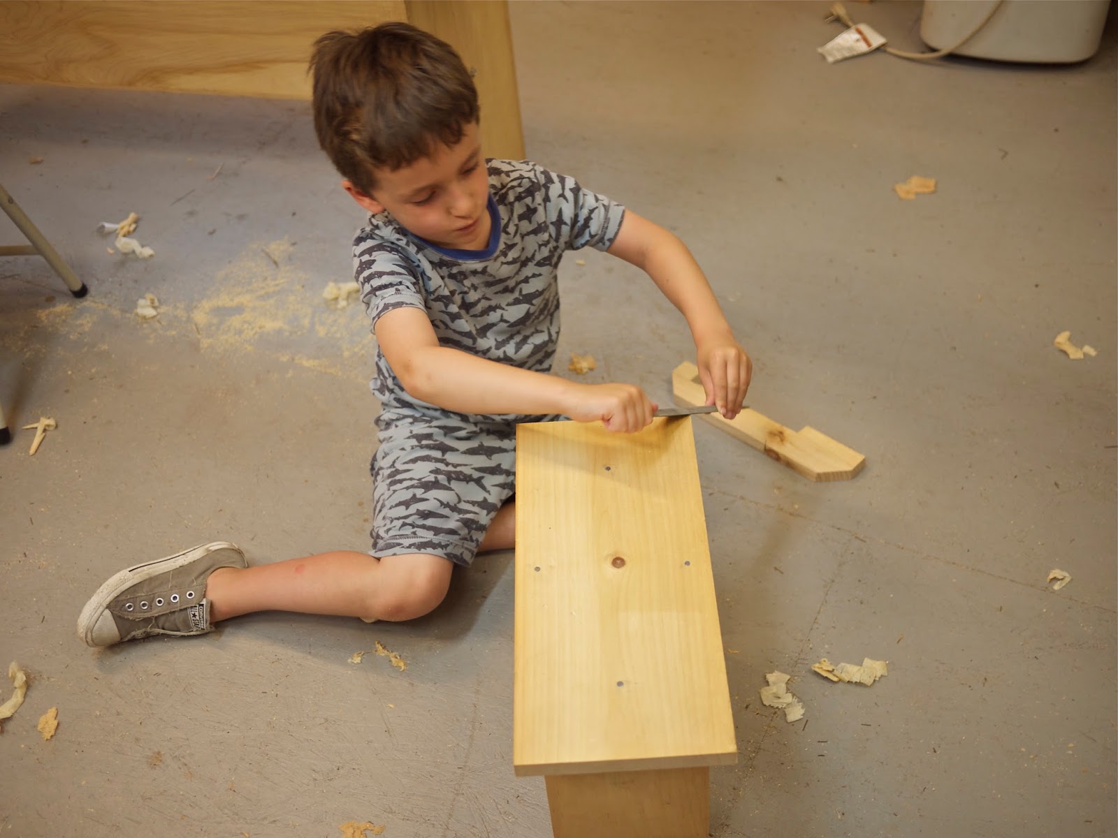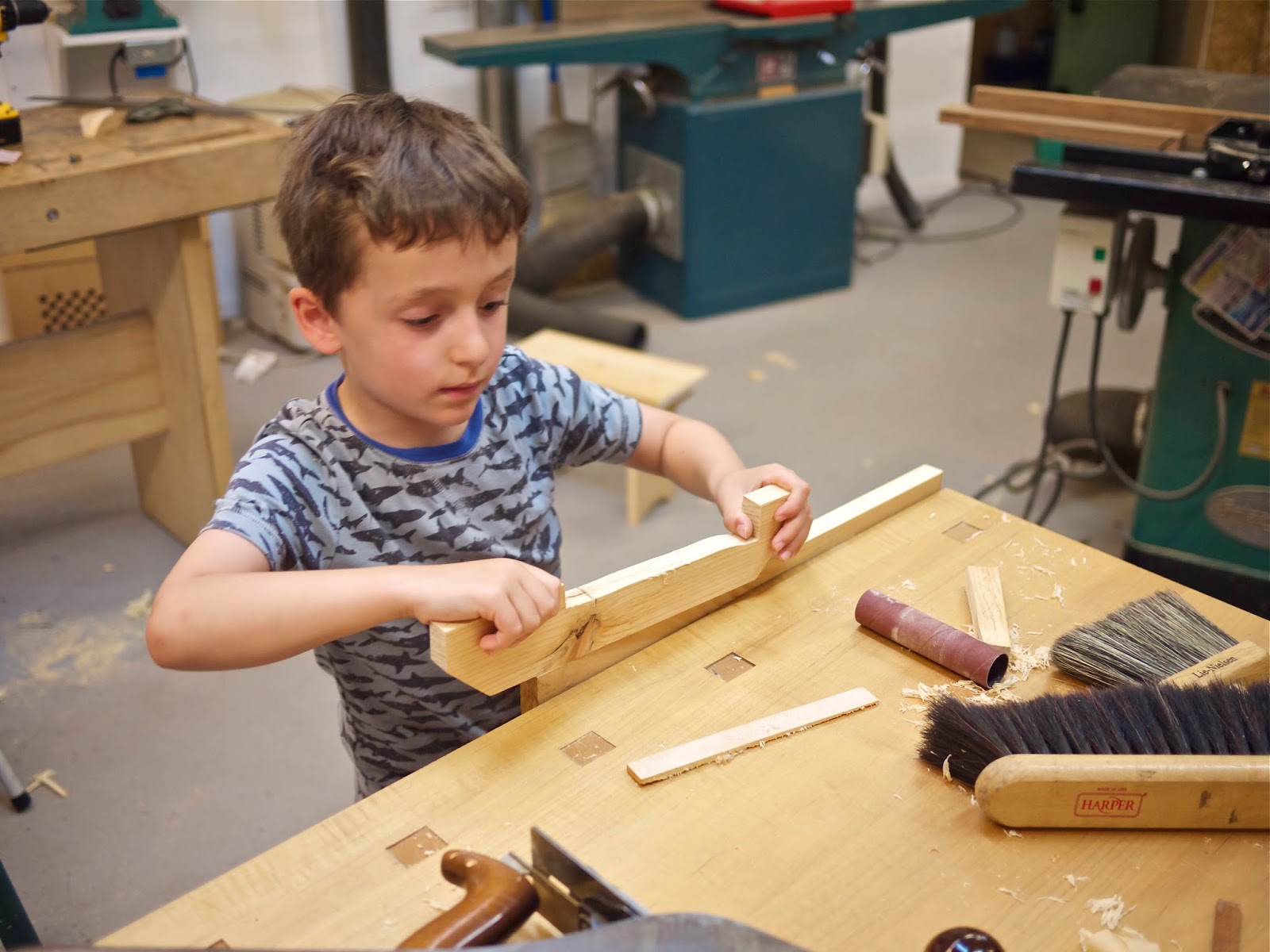As you can see in the picture above at some point your fledgling woodworker may become more interested in being creative with the off cuts. Let Them. It gives them an attention span break from the project. As you progress to more interesting parts of the build their attention will come back to the project.