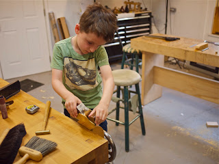 At some point in the process Everett (JP) grabbed a board, a pencil and started marking lines onto the board. He asked me to cut the marked out parts from the board on the bandsaw. I didn't question him I just did it. He then marked a few more lines on the board and asked me to cut them as well. When I handed it back to him he pronounced that it was a pretend plane and he walked over to the board in the vise and proceeded to make a planing motion across the board. Give them a chance and their imagination will lead to creativity.