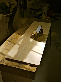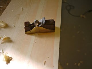 As I mentioned this will be a painted piece so I glued up the side panels from some already surfaced pine. The next day as I began to work these surfaces I didn't just randomly start cross traversing the surface. I checked the surface with a straight edge to determine where work was needed. In the picture above I planed across the width of the panel because there was actually 2 high spots present across the width of the board. When these were mostly removed I planed down the length of those areas and then in order to promote adhesion of the paint I sanded the panel with 150 grit sand paper. This is the inside surface of the side so I was done. The interior surface needed no further refinement.